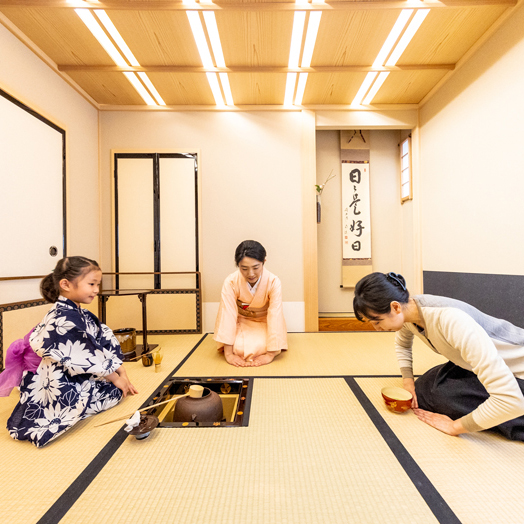茶道教室では、ご家族がそれぞれの形で茶道を身近に学べるコースと6カ月で茶道の所作・基礎知識を学べる短期集中型プログラムコースをご用意しております。茶道には厳しいイメージがありますが、お子さまも大人も楽しく所作・日本文化の基礎知識・禅の考え方を実技・座学両面からトータルで学んで頂けます。日本人としての教養を型苦しくなく身に着けてみませんか。お子さまとともに素敵な親子を目指しましょう。